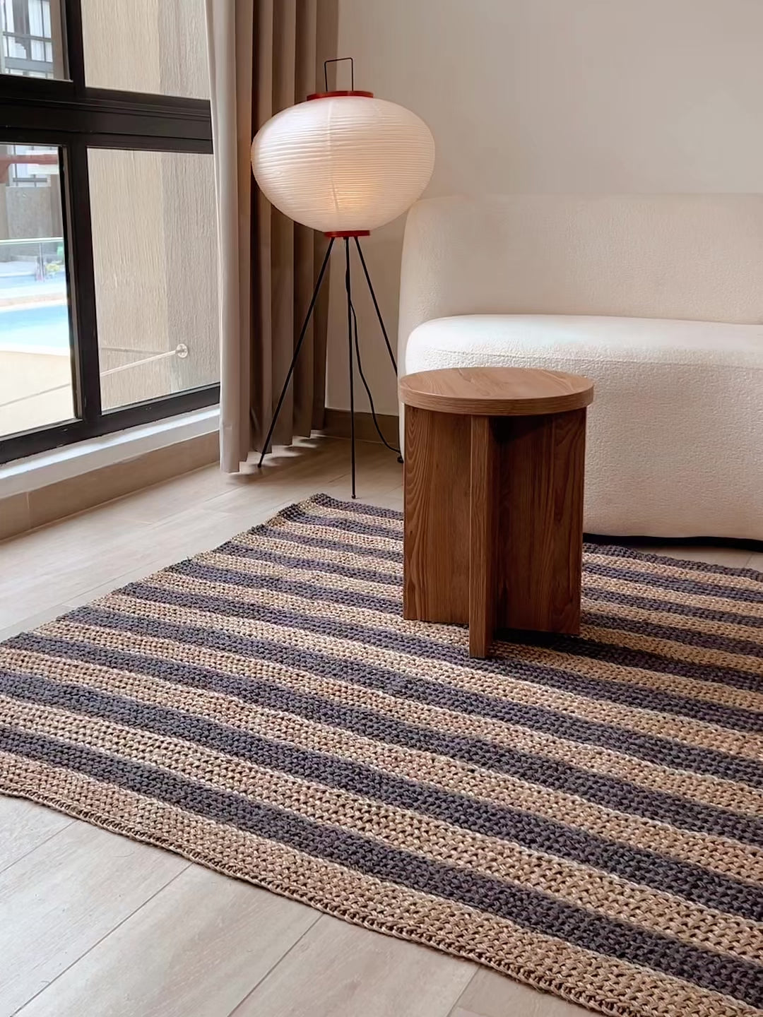 Each rug is handwoven using the traditional crochet technique with two needles, a process that enhances both strength and texture.